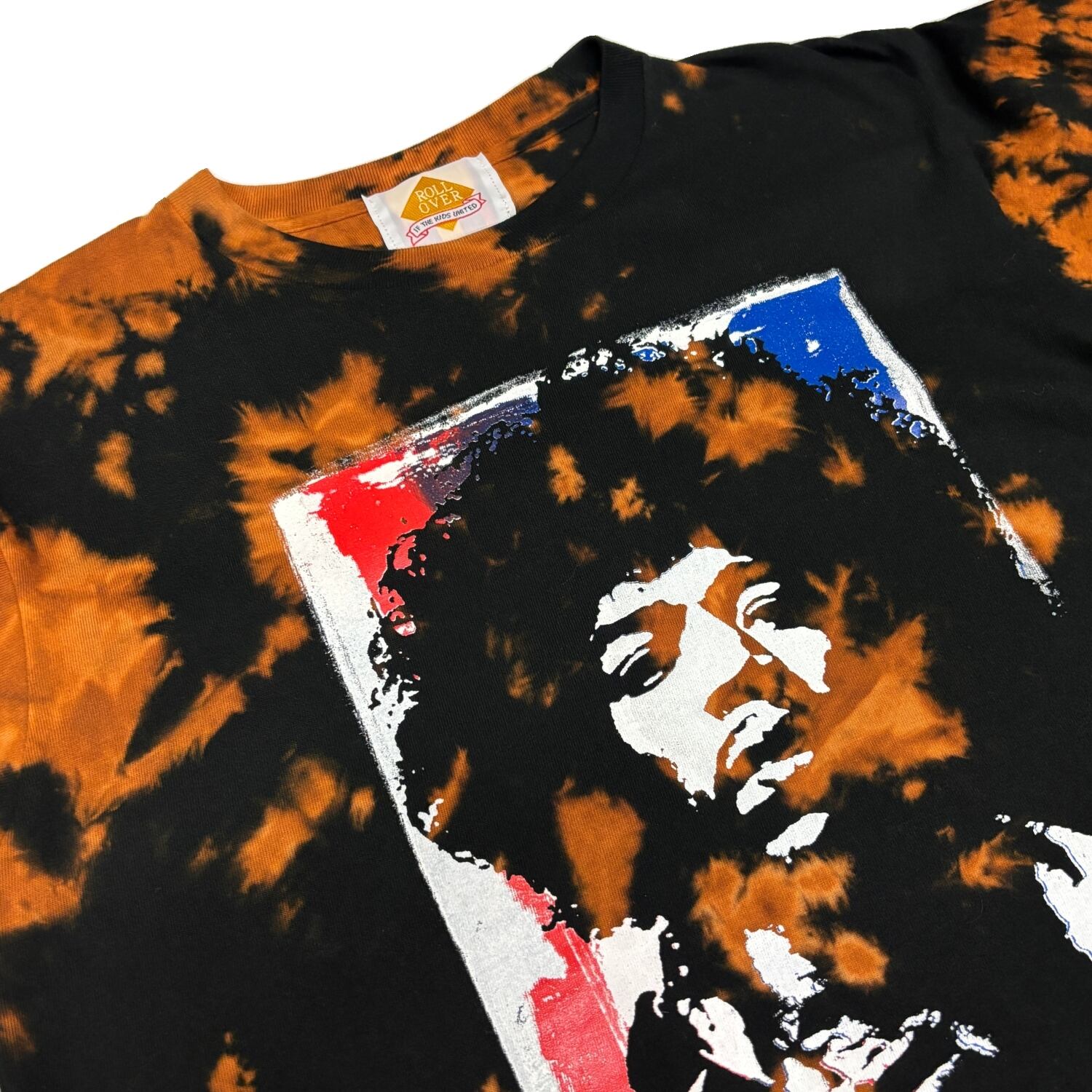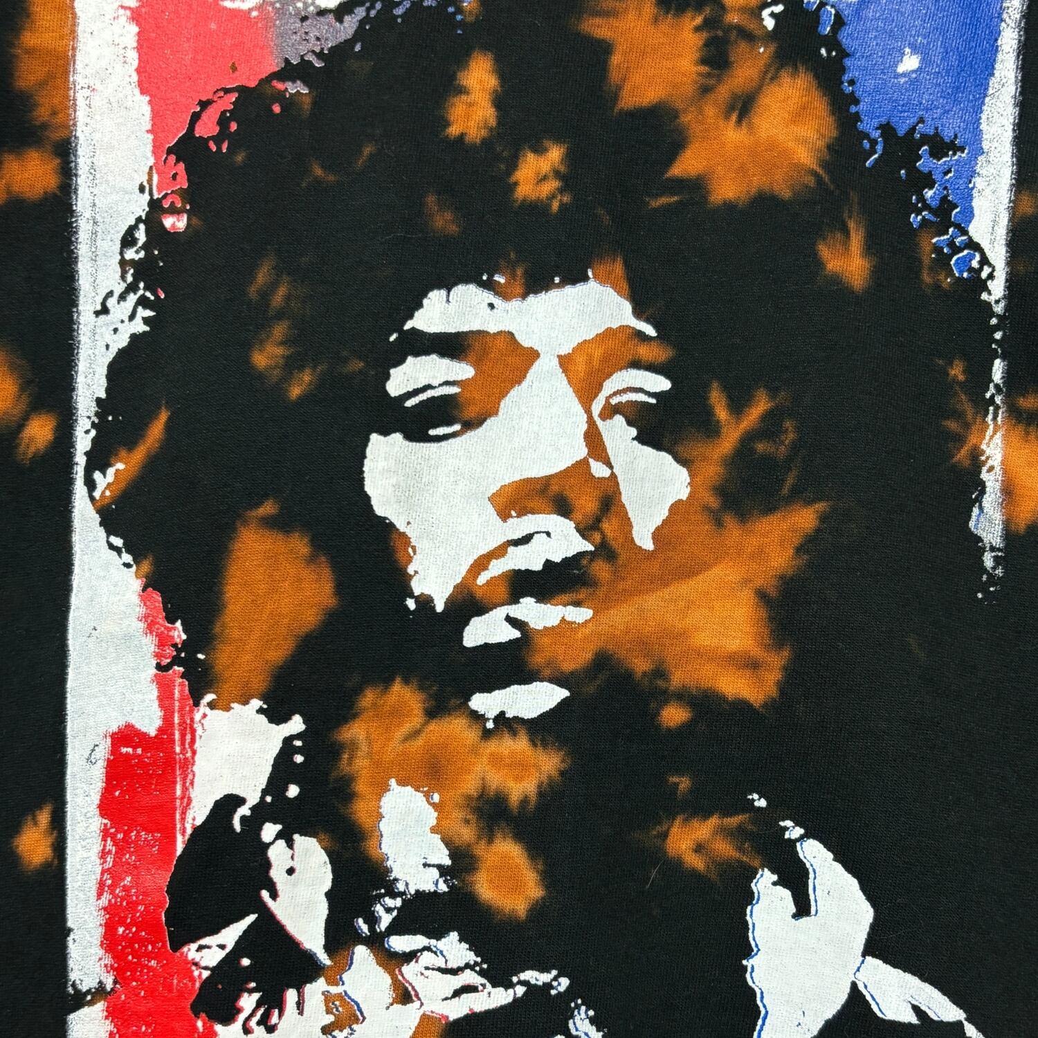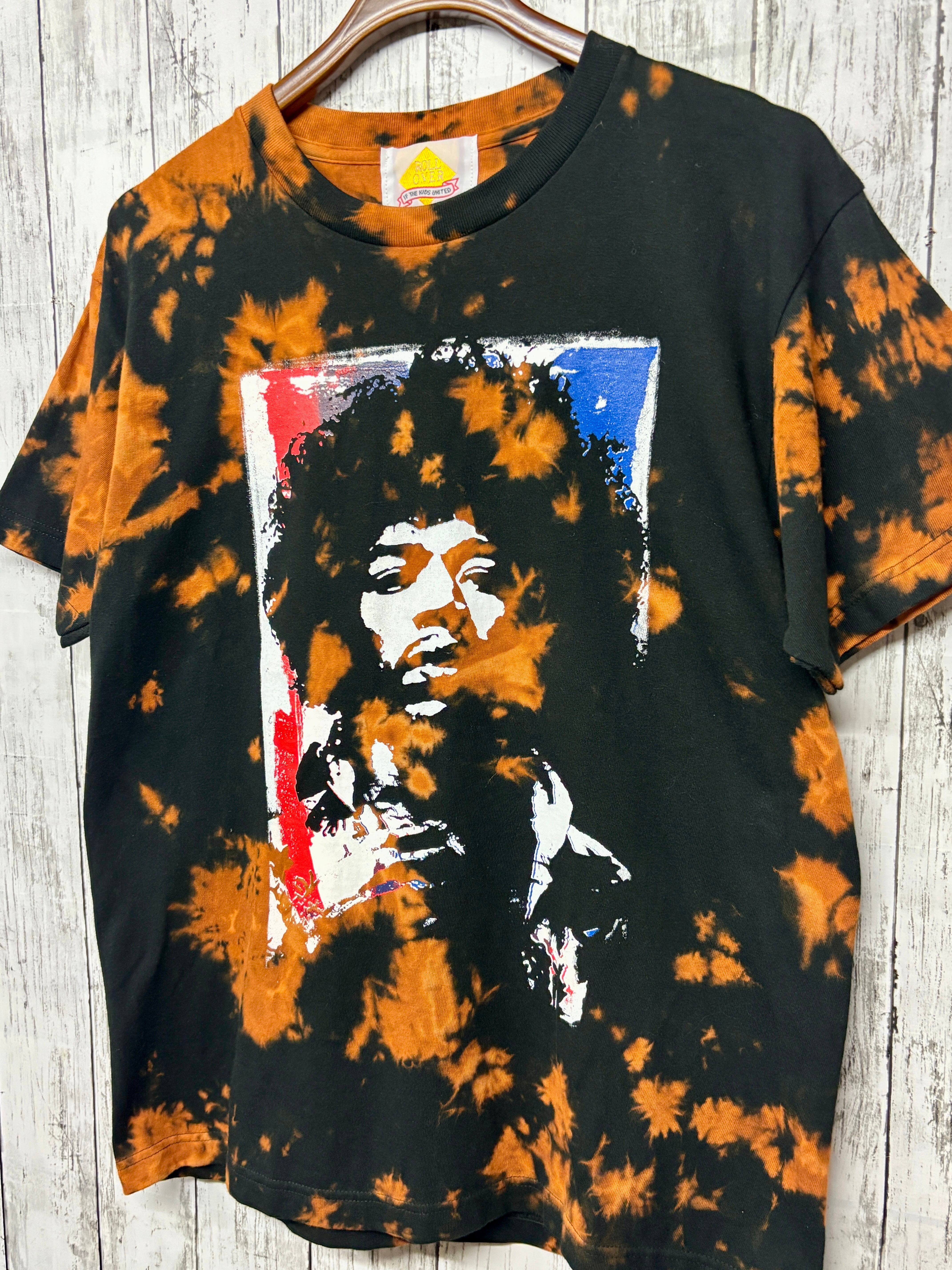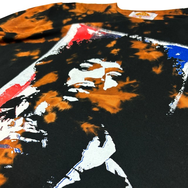 伝説のギタリストのプリントとサイケデリックなカラーが融合した、唯一無二のTシャツです。