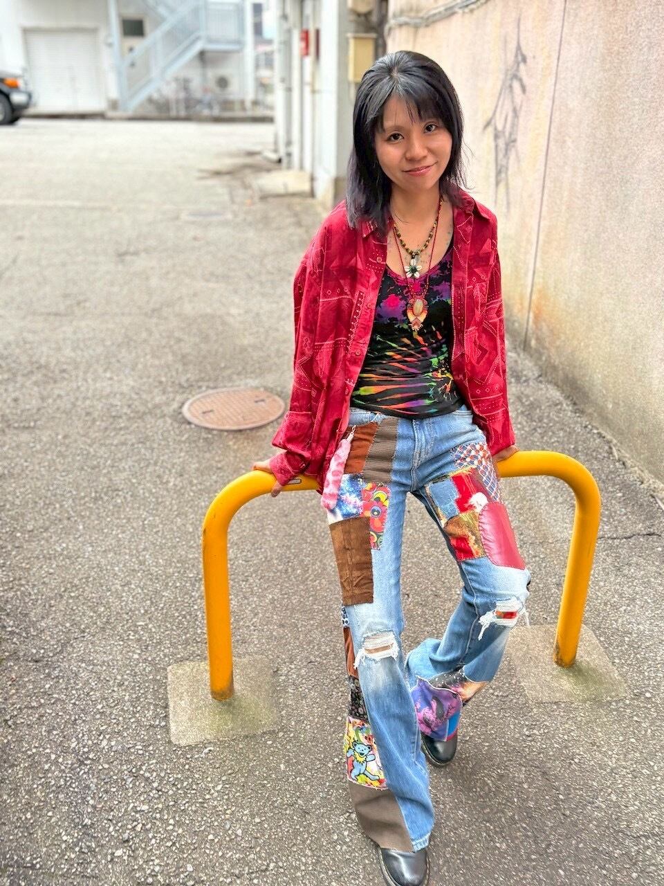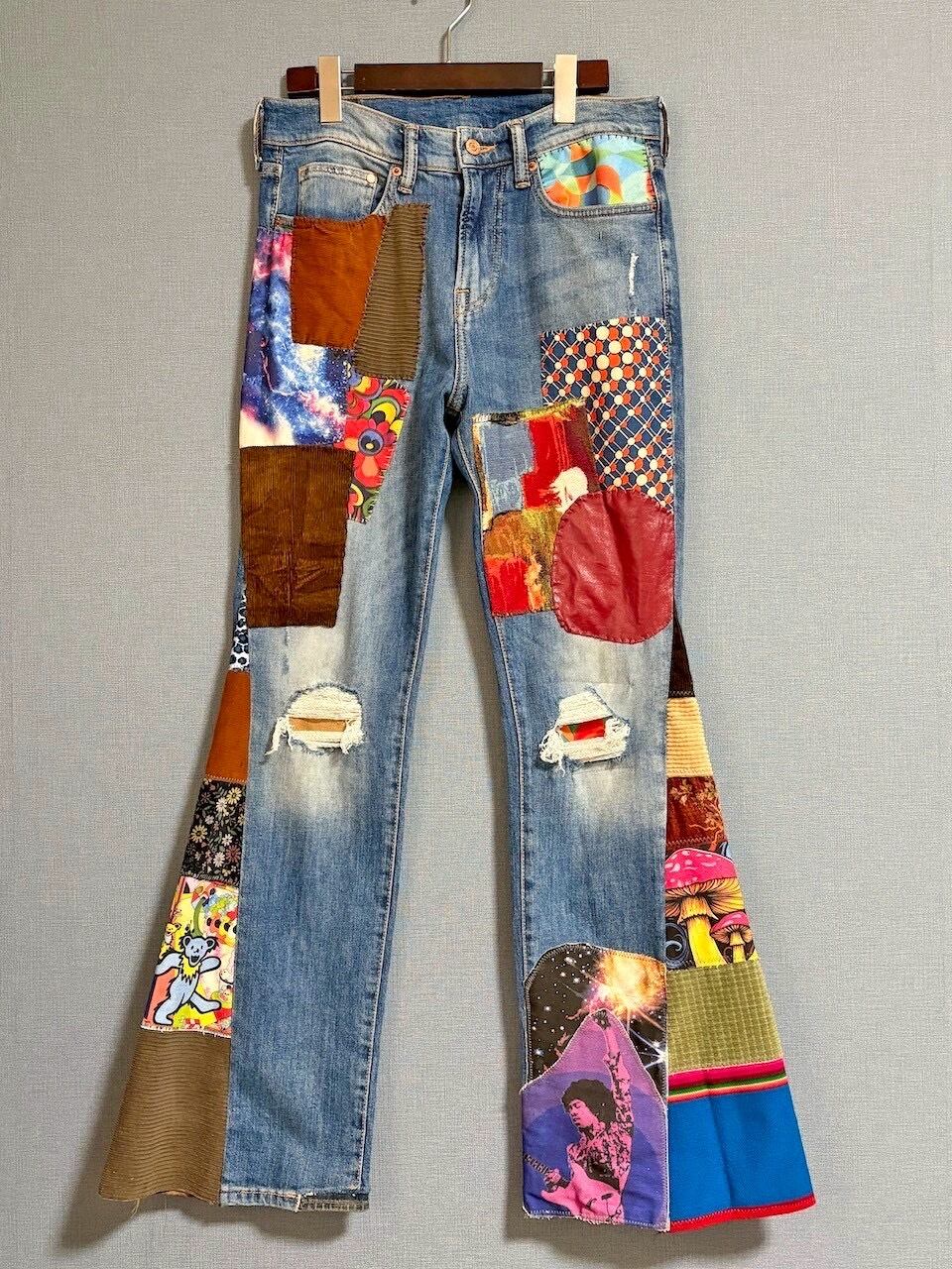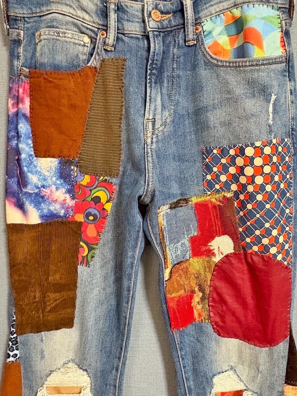 ダメージとカラフルなパッチが絶妙にマッチして、穿くだけで主役になれる1本です。