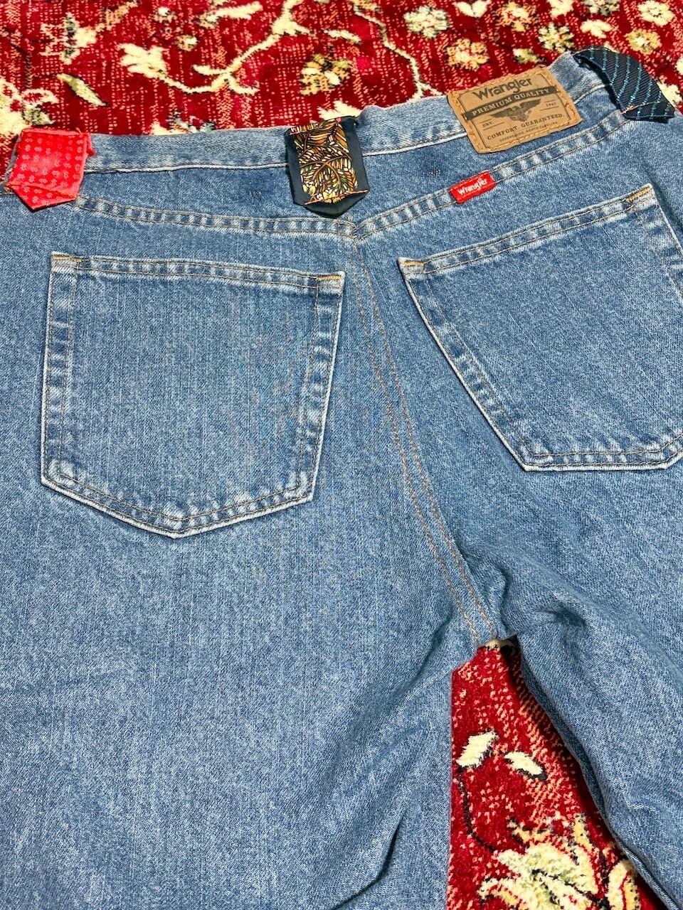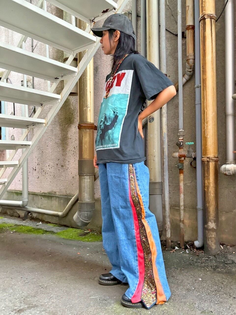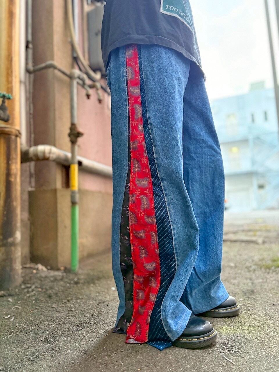 ネクタイと古着デニムを再利用して制作した、唯一無二のリメイクデニム。